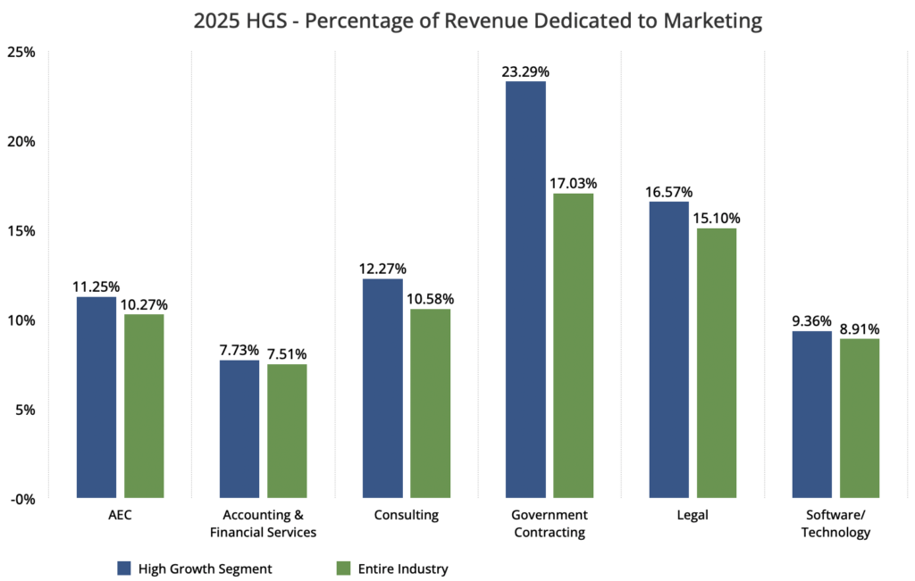 Os dados em si não têm muito a dizer nesse sentido. Mas podemos dizer-lhe, pela nossa experiência de trabalho com empresas em todos estes setores, que uma vasta gama de fatores contribui para estas diferenças. Por exemplo, na indústria AEC, os custos de repasse (materiais, equipamentos, mão de obra contratada, etc.) muitas vezes constituem uma grande proporção das suas receitas, potencialmente deprimindo artificialmente os números do seu orçamento de marketing. As empresas do setor de contabilidade (distinto dos serviços financeiros) geralmente gastam menos em marketing porque têm uma alta porcentagem de negócios repetidos ano após ano. Outras indústrias, como a contratação governamental, relatam gastos mais elevados em marketing como forma de combater a oferta intensamente competitiva tanto para o trabalho governamental como para os acordos de formação de equipas. E é claro que existem empresas em todos os setores dos serviços profissionais que podem ver-se nestas circunstâncias “únicas”.