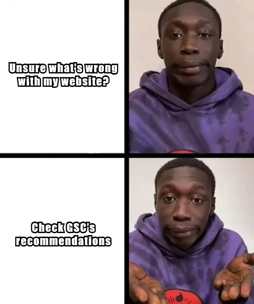 O Google anunciou que implementou totalmente suas recomendações. Esse recurso já estava disponível em caráter experimental, mas agora deve aparecer em todas as contas do GSC e fornecer algumas dicas sobre o que o Google acha que pode estar errado com seu site.